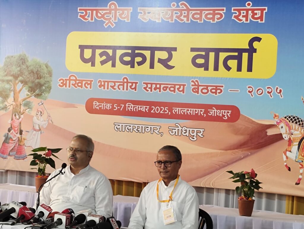 राष्ट्रीय स्वयंसेवक संघ की अखिल भारतीय समन्वय बैठक के उपरांत 07 सितंबर, 2025 को लालसागर में आयोजित पत्रकार वार्ता में अ. भा. प्रचार प्रमुख सुनील आंबेकर जी ने शिक्षा, समाज और राष्ट्रीय जीवन के विविध पहलुओं सहित संघ शताब्दी वर्ष की योजनाओं पर विस्तृत जानकारी साझा की।
