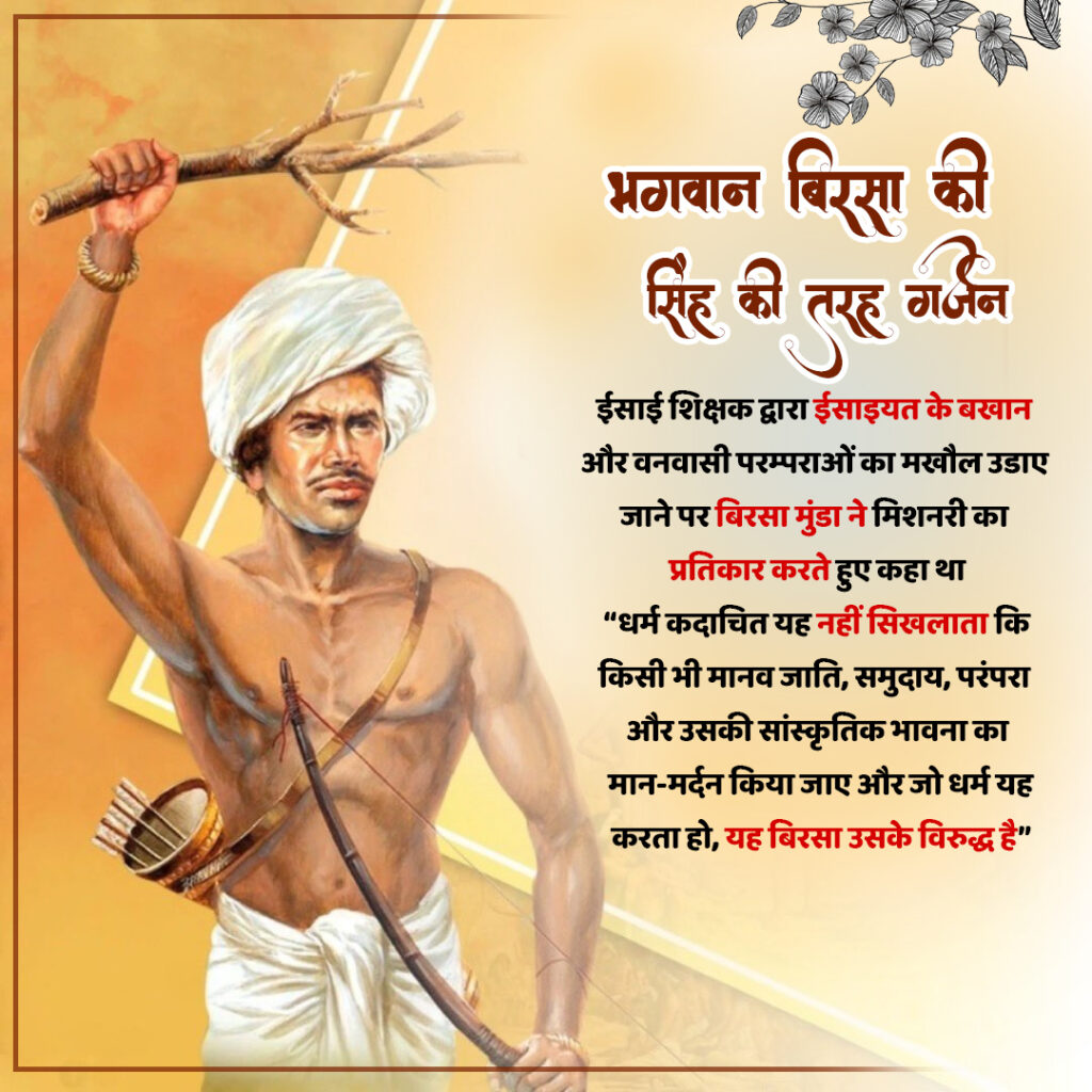केवल 15 वर्ष की आयु में ईसाई मिशनरियों के षडयंत्रों को समझते हुए उन्होंने समाज जागरण के द्वारा अपनी धार्मिक अस्मिता और परम्पराओं की रक्षा के लिए संघर्ष प्रारंभ कर दिया। मात्र 25 वर्ष की आयु में भगवान बिरसा ने उनके समाज में सांस्कृतिक पुनर्जागरण की लहर पैदा कर दी जो स्वयं विकट परिस्थितियों से ग्रस्त था। ब्रिटिश शासन द्वारा प्रशासनिक सुधार के नाम पर वनों का अधिग्रहण करते हुए जनजातीय समाज से भूमि का स्वामित्व छीनना तथा जबरन श्रम नीतियां लागू करने के विरोध में भगवान बिरसा ने व्यापक जन आंदोलन खड़ा किया। उनके आंदोलन का नारा “अबुआ दिशुम-अबुआ राज” (हमारा देश-हमारा राज) युवाओं के लिए एक प्रेरणा मंत्र बन गया, जिससे हजारों युवा “स्वधर्म” और “अस्मिता” के लिए बलिदान देने हेतु प्रेरित हुए। जनजातियों के अधिकारों, आस्थाओं, परंपराओं और स्वधर्म की रक्षा के लिए भगवान बिरसा ने अनेक आंदोलन व सशस्त्र संघर्ष किए। अपने पवित्र जीवन लक्ष्य के लिए संघर्ष करते हुए वह पकड़े गए और मात्र 25 वर्ष की अल्पायु में कारागार में दुर्भाग्यपूर्ण और संदेहास्पद परिस्थिति में उनका बलिदान हुआ। समाज के प्रति अपने प्रेम और बलिदान के कारण संपूर्ण जनजाति समाज उन्हें देव स्वरूप मानकर धरती आबा भगवान बिरसा मुंडा कहकर श्रद्धान्वत होता है।