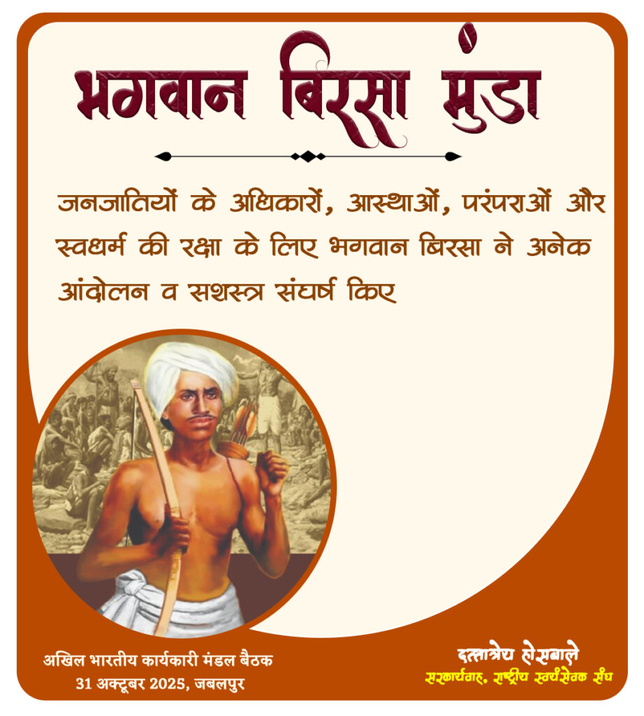 भारत के गौरवशाली स्वाधीनता संग्राम में जनजातीय स्वतंत्रता सेनानियों व योद्धाओं की एक दीर्घ परंपरा रही है और उनका योगदान अविस्मरणीय रहा है। भगवान बिरसा मुंडा का इस स्वतंत्रता संग्राम के श्रेष्ठतम नायकों, योद्धाओं में विशेष स्थान है। 15 नवंबर 1875 को उलीहातु (झारखंड) में जन्मे भगवान बिरसा का यह 150 वाँ जन्म वर्ष है। अंग्रेजों और उनके प्रशासन द्वारा जनजातियों पर किए जा रहे अत्याचारों से त्रस्त होकर उनके पिता उलीहातु से बंबा जाकर बस गए। लगभग 10 वर्ष की आयु में उन्हें चाईबासा मिशनरी स्कूल में प्रवेश मिला। मिशनरी स्कूलों में जनजाति छात्रों को उनकी धार्मिक परंपराओं से दूर कर ईसाई मत में मतांतरित करने के षड़यंत्र का उन्हें अनुभव आया। मतांतरण से न केवल व्यक्ति की धार्मिक आस्था और सांस्कृतिक चेतना अवरुद्ध होती है बल्कि धीरे-धीरे समाज की अस्मिता भी नष्ट हो जाती है।