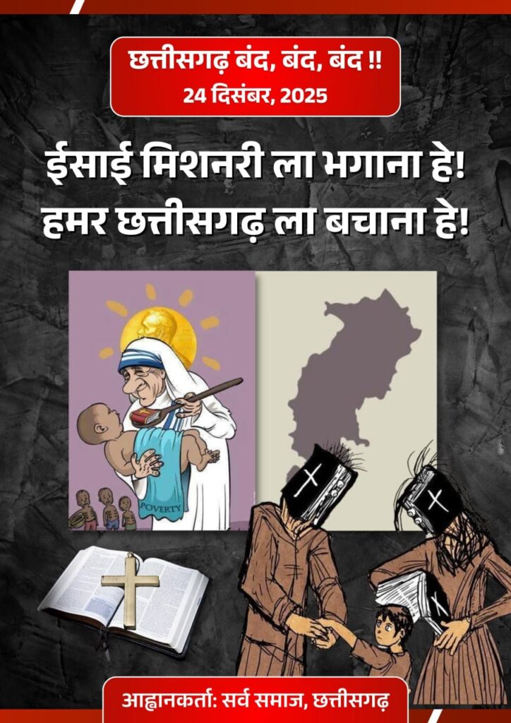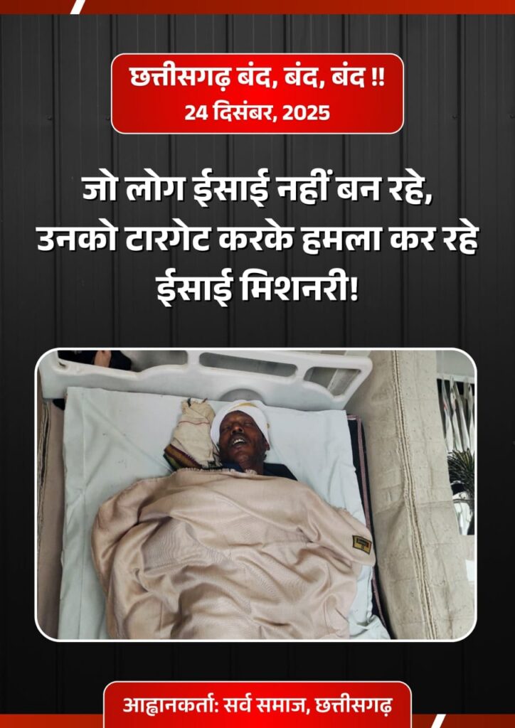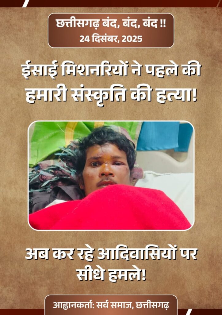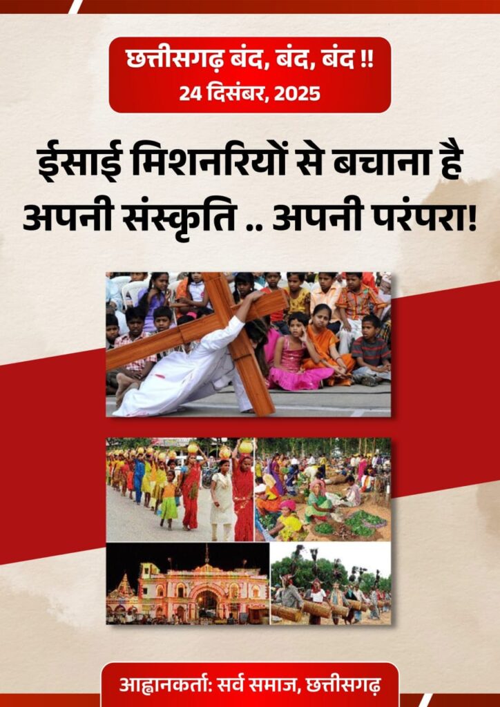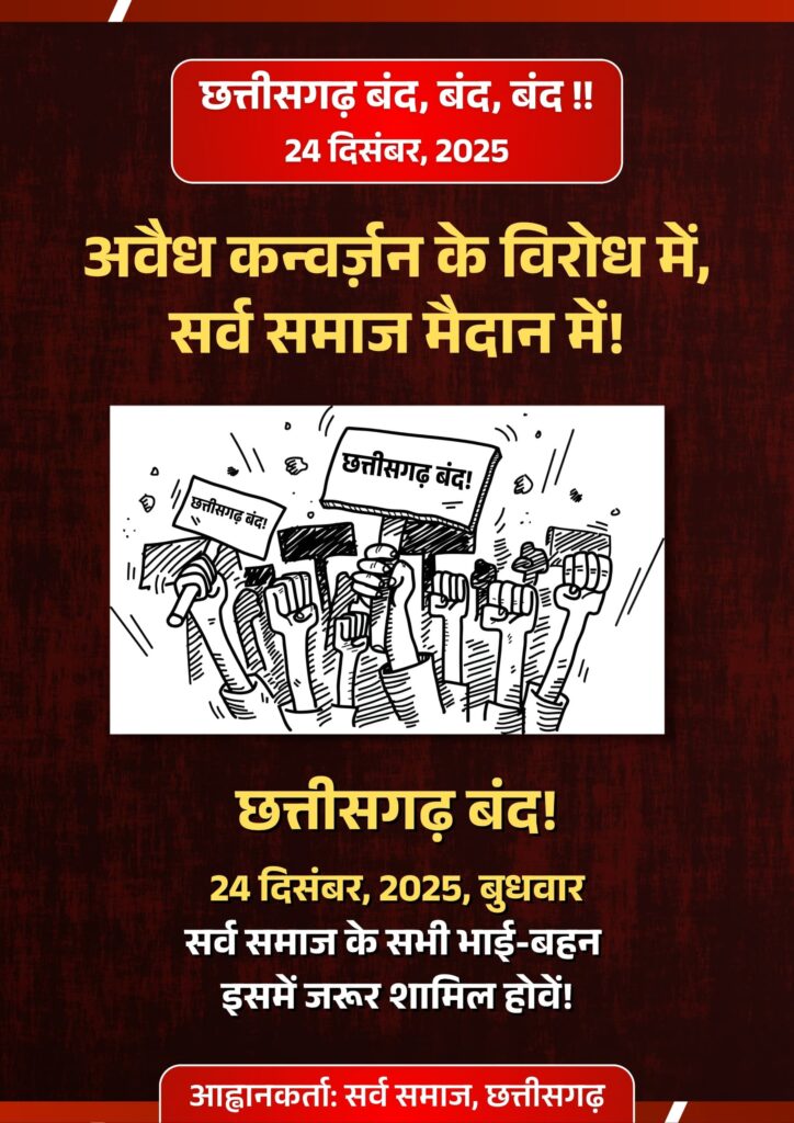 रायपुर : छत्तीसगढ़ में लगातार बढ़ती कन्वर्जन की घटनाओं से सर्व समाज में आक्रोश व्याप्त है. सर्व समाज ने इस मुद्दे पर प्रदेश व्यापी बंद का ऐलान किया है. मंगलवार को सर्व समाज ने प्रेस वार्ता कर 24 दिसंबर को होने वाले प्रदेशव्यापी बंद की जानकारी दी. सर्व समाज के पदाधिकारीयों ने प्रेस को संबोधित करते हुए कहा, सर्व समाज, छत्तीसगढ़ यह स्पष्ट रूप से अवगत कराता है कि प्रदेश में लगातार उत्पन्न हो रही सामाजिक अशांति, जनजातीय आस्था पर आघात तथा संगठित रूप से पैदा किए जा रहे सांस्कृतिक टकराव के विरोध में दिनांक 24 दिसंबर 2025 को प्रदेशव्यापी छत्तीसगढ़ बंद का आह्वान किया गया है। यह बंद पूर्णतः शांतिपूर्ण, लोकतांत्रिक एवं संवैधानिक दायरे में आयोजित किया जाएगा, जिसमें सर्व समाज के विभिन्न सामाजिक, जनजातीय एवं नागरिक संगठन सहभागिता करेंगे. सर्व समाज का कहना है, कांकेर जिले के आमायेड़ा क्षेत्र में हाल ही में घटित घटना कोई पहली या एकमात्र घटना नहीं है। इस प्रकार की घटनाएं इससे पूर्व भी छत्तीसगढ़ के ना सिर्फ जनजातीय एवं ग्रामीण अंचलों में सामने आती रही हैं, बल्कि कई बार मैदानी क्षेत्रों में भी विवाद की स्थिति बनी है. एक निश्चित पैटर्न के अंतर्गत ईसाई मिशनरियों एवं उनसे जुड़े कन्वर्जन-प्रेरित समूहों द्वारा सुनियोजित ढंग से ऐसे हालात निर्मित किए जा रहे हैं, जिनसे समाज में तनाव, टकराव और सामाजिक वैमनस्य फैल रहा है। दुर्भाग्यवश, इन घटनाओं का सीधा दुष्परिणाम सर्व समाज, विशेषकर जनजातीय समुदायों को भुगतना पड़ रहा है.