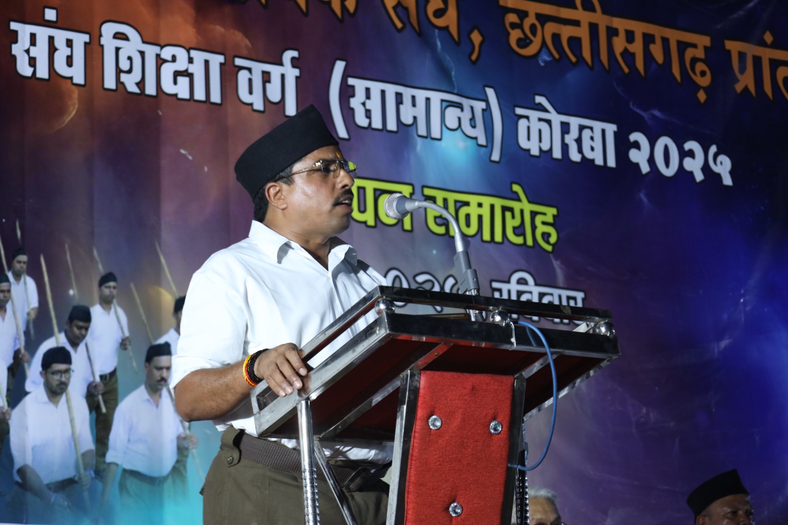कार्यक्रम के मुख्य वक्ता श्रीमान नारायण नामदेव जी ( सह प्रांत प्रचारक,छत्तीसगढ़ )_ ने कहा कि ऊर्जा नगरी माँ सर्वमंगला के सानिध्य में राष्ट्रीय स्वयंसेवक संघ का यह संघ शिक्षा वर्ग 15 दिवसीय कार्यक्रम बहुत ही श्रेष्टम अर्हताओ को पूर्ण करते हुए संपन्न हो रहा है | जो आप सभी ने अभी शारीरिक प्रदर्शन देखा यह एक प्रशिक्षण पद्धति का एक भाग है | जिससे शारीरिक स्वास्थ्य के साथ-साथ सामाजिक स्वास्थ्य भी बना रहे, क्योंकि शक्ति का विरोधी और दुष्ट शक्तियों के सामने ये प्रदर्शन आवश्यक है | यह कोई संघ ने नया काम प्रारंभ नहीं किया, यह तो सनातन काल से जो हमारे वेद पुराणों में वर्णित है, जो संत-महंतों ने, महापुरुषों ने, क्रांतिकारियों ने हमारे समक्ष पूर्व काल में जो आदर्श रखा है उसी को आधार मानकर संघ आगे बढ़ रहा है |